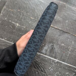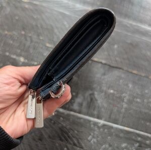 Elegant wallet with iconic logo pattern. Features zip closure. Ideal for daily essentials.