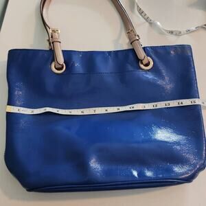 Michael Kors patent leather tote. This is the popular Jet Set tote in a bright blue patent leather with tan leather handles.