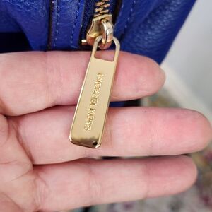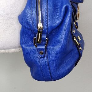 Gorgeous vibrant blue slightly slouchy pebbled leather Bedford Satchel from Michael Kors! Gold hardware in near-perfect condition! Long adjustable cross-body strap and handles. Big clean interior with pouches and an exterior pouch. Michael Kors logo charm!