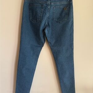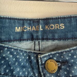 Chic blue denim with subtle polka dot pattern. Gold button accents. Iconic Michael Kors logo.
