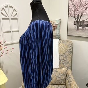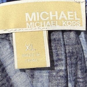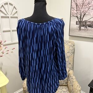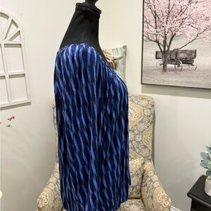 This Michael Kors blouse features a relaxed fit with a striking pattern of vertical wavy stripes in royal and navy blue. The 3/4 sleeves and ruched detailing add a touch of elegance, while the soft, stretchy fabric ensures a comfortable wear.