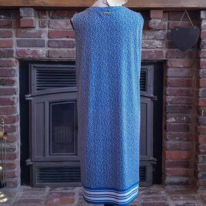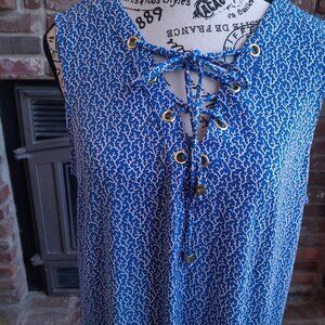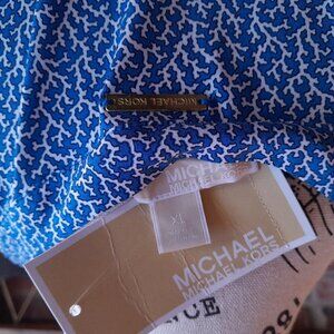 Michael Kors Blue Shift Dress NWT XL Comfy summer Sleeveless Knee length dress. Blue and white branch pattern. Stripes on bottom. Tie V-neck with grommets closure. Has a 1 1/2" snag near bottom hemline took awhile to notice. Bumps in fabric left side bellow and left of bottom of V-neck did not detect until smoothing out to measure. Approx. Measurements: Waist 47", Length 37.5, Bust 42", Hips 49". Pet friendly home.