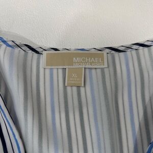 Beautiful Michael Kors dress in size XL featuring a flattering wrap-style front, elastic waist, and flowy ruffled hem. Lightweight fabric with soft blue and white stripes gives it a breezy, summery feel. The flutter sleeves and V-neckline make it perfect for brunch, vacations, or casual weekend outings. Effortlessly chic and comfortable!