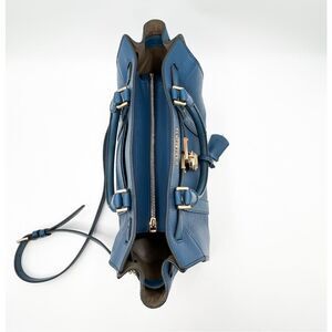 Elegant blue tote with gold accents. Features signature lock detail. Spacious interior.