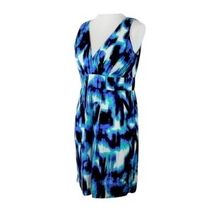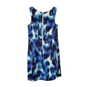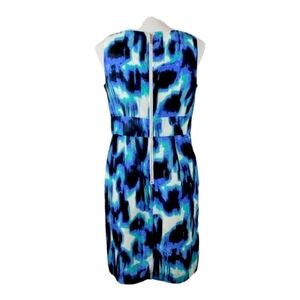 Michael Michael Kors sleeveless silk blend sheath dress in vibrant blue and black watercolor print. Surplice V-neckline. Side pockets. Wide waistband flatters the figure. Very good condition.