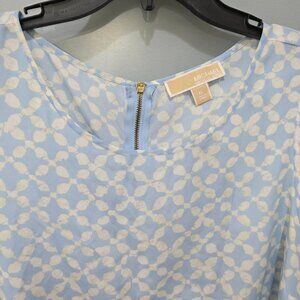 Add a touch of timeless elegance to your wardrobe with this Michael Kors sleeveless blouse in a soft blue and white abstract polka dot print 💙. Crafted from a lightweight, flowy fabric, this blouse offers a flattering drape with a zipper back detail for easy wear and a polished finish.