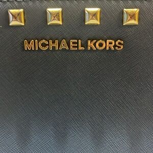 This Michael Kors crossbody bag in a striking blue hue is adorned with gold-tone studs, offering a blend of elegance and modern style. Crafted with a structured design, it features a convenient crossbody strap for easy carrying. The gold Michael Kors branding adds a touch of luxury to this versatile accessory.