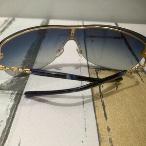 Chic sunglasses with gradient blue lenses. Gold detailing adds elegance. Ideal for stylish outings.