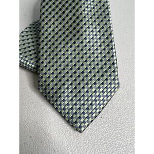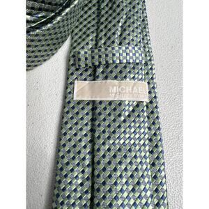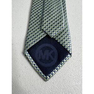 The Michael Kors Blue and Green Checkered Designer Tie is a luxurious accessory for men crafted from 100% silk. This classic necktie features a stylish checkered pattern in vibrant green colors, adding a sophisticated touch to any outfit. Made in China, this woven fabric tie exudes designer elegance and is sure to make a statement at any formal event or in a professional setting. The timeless design and high-quality material make it a valuable addition to any wardrobe. New without tags.
