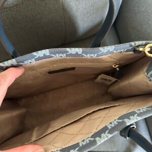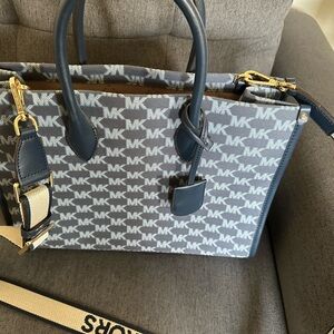 Stylish Michael Kors satchel. Features blue and white pattern. Includes branded strap and gold hardware.