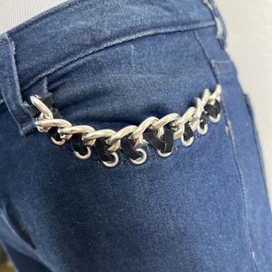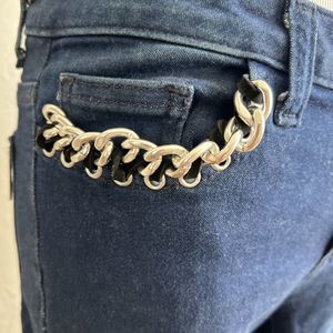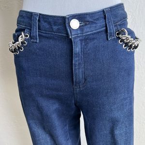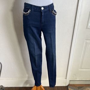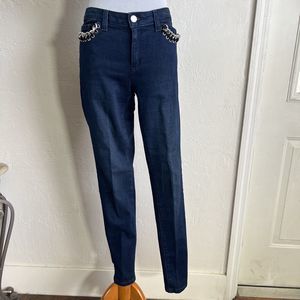 Michael Kors Blue dark rinse Leather & Gold braided Metal Chain Skinny Jeans 2, in very good used condition. This jeans are like new there is no visible damage. Please see pictures for item description and measurements.