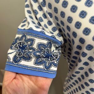 Michael Kors Blue and White Sheath Dress with Cuffed Sleeves