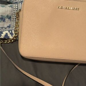 Chic blush crossbody by Michael Kors. Features gold chain strap. Used but in good condition. Two large pockets on inside. Smoke free.