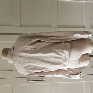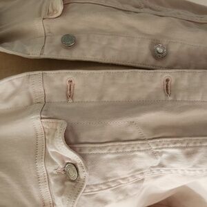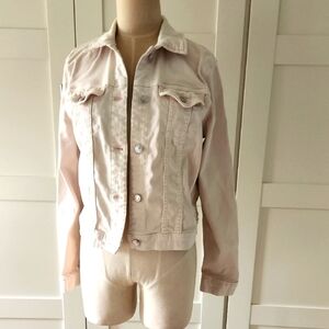 Stylish blush denim jacket. Features classic button-up design. Ideal for casual wear.