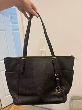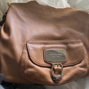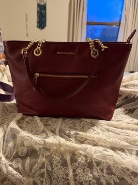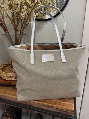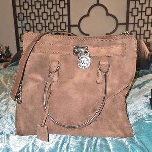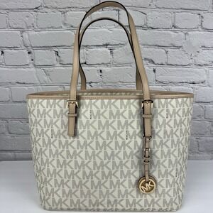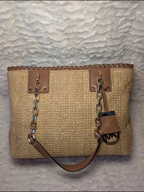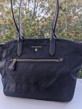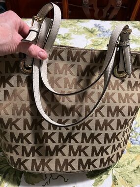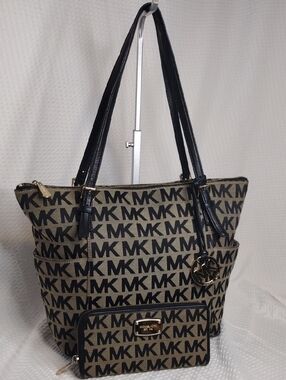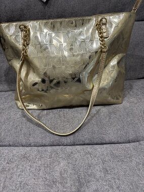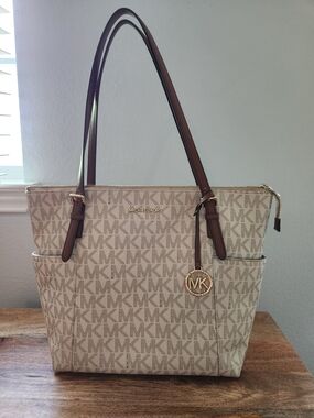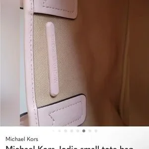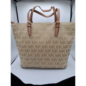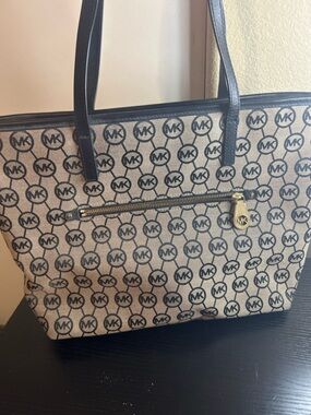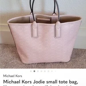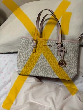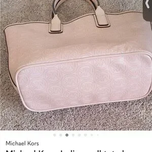 Chic Michael Kors tote in blush pink. Features signature MK pattern. Ideal for everyday use.