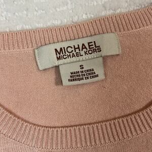 This Michael Kors sleeveless sweater vest in a charming pink hue features a classic crew neckline and ribbed trim for a refined look. Its lightweight knit material makes it perfect for layering, adding a touch of elegance to any outfit. Material is Silk, Cotton, Cashmere and Spandex. Excellent condition. Size Small. Measurements pictured. Made in China.