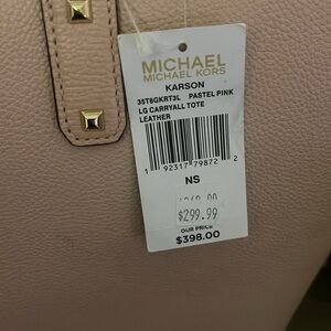Chic Michael Kors tote in blush pink. Features sleek design and gold-tone accents. Perfect for everyday elegance.