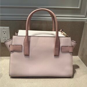 Stylish satchel with blush and white tones. Features signature MK logo. Ideal for any occasion.