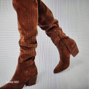 Michael Kors "Bodkin" Over the Knee Suede Heeled Boots. NIB. Size 5. NIB/Original box/packaging. No rips/stains/tears/peeling. A Few scattered black dots on the bottoms. Box has minor damage from shipping. Smoke free home. No odors. Top of boot lying flat is 7.5 inches. Not much stretch, not for wide calf. Thank you!
