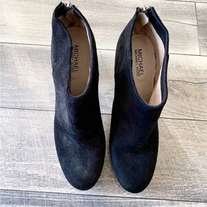 Michael Kors black suede booties with snakeskin heels and small platform. Back silver zipper. Thick heel. Rounded toe. Super cute and can wear with anything! Great classic staple shoe to have in your closet. Classic, sexy & edgy all in one! Love these boots but I must part with some pairs.