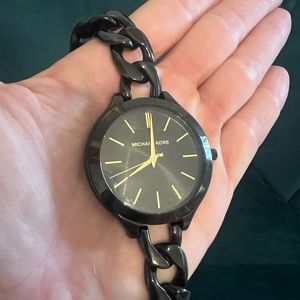 Black chain bracelet watch with gold detailing on the face. All original links included. Does not come with packaging and will need a new standard watch battery.