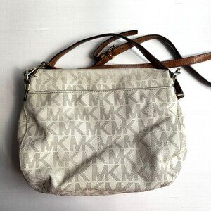 This stylish crossbody bag offers a compact design with adjustable straps and signature MK logo print. It's both functional and trendy for daily outings.