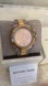 Fixed rose gold-tone bezel. Rose dial with rose gold-tone hands and alternating index and Roman numerals hour markers.