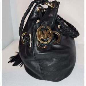 * Braided straps and cinch cord, large gold tone grommets, tassels and MK hang tag.