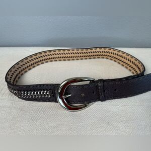 Michael Kors Size Medium thick, sumptuous dark brown pebbled leather belt w woven leather and silver chain down middle, whipstitch edges, large silver silver chrome oval buckle