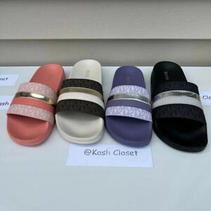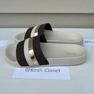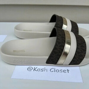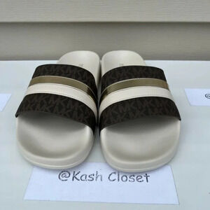 Michael Kors Brandy Metallic Striped Logo Slide Sandal- Cream