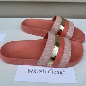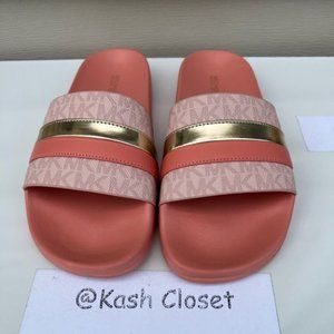 Michael Kors Brandy Metallic Striped Logo Slide Sandal- Sherbert