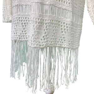 Beautiful bohemian style white crochet cardigan sweater features an open front, gorgeous fringe detail at bottom hem, gold tone logo plate sewn onto back neckline and long sleeves. A staple piece for your summer wardrobe; layer over a sundress or pair with denim shorts and a tee for a casual-chic look.