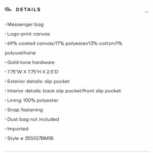 Brand new in original packaging, this is a Michael Kors Briley small Crossbody messenger bag. See photos for measurements, this is the perfect size bag for a shopping trip, or any event where you need a little bit of storage but not a bulky bag. I love the fact that this has a back slot for your phone and an adjustable strap. The magnetized button closure and the gold hardware make it the perfect bag. Inside slip pockets on both sides. Wide-open space in addition to that. A style that will stand the test of time. Great gift for someone else or just for yourself.