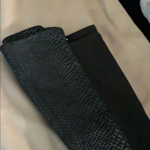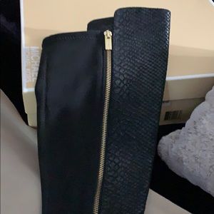 Black Embossed Leather over-the-knee boots by Michael Kors. Gold zipper all the way up the inside: with stretch fabric in the back for comfort. Boot length is approx 22” in the front and approx 20” in the back if you include the 1” heel. These boots are in excellent condition with no scuffs or scratches as I only wore them a few times and kept them in the box.