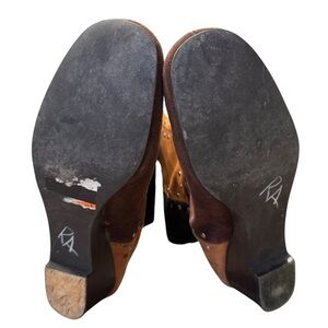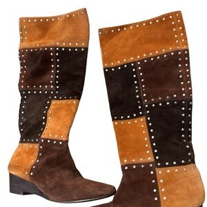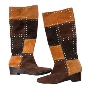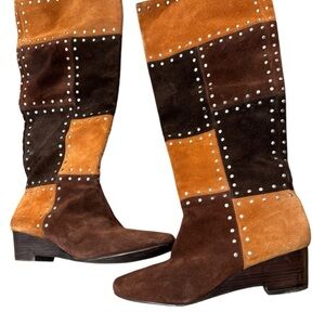 Insane, statement-making patchwork leather boots from Michael Kors with silver studs throughout. Size 9M. There is some white discoloration from snow/salt and one heel needs to be redone, but these are worth the TLC.