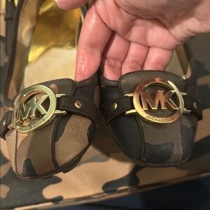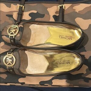 Stylish Michael Kors ballet flats in brown. Features gold accents and logo detail.