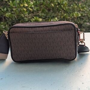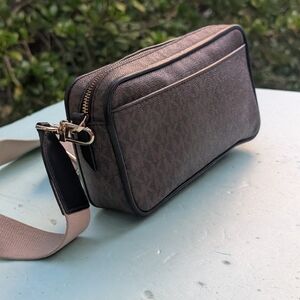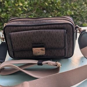 Stylish Michael Kors crossbody bag. Features a sleek design with gold accents. Perfect for everyday use.