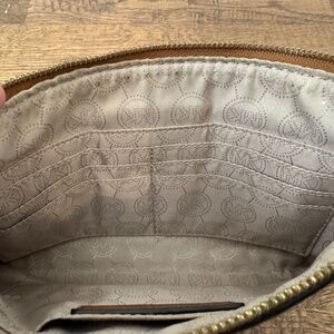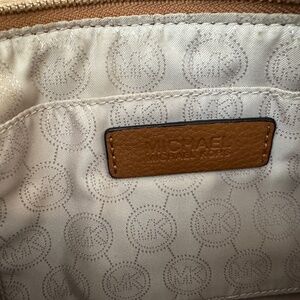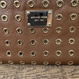 Michael Kors Brown Gold Grommet Large Pebbled Leather Wristlet - excellent condition - only minor scratches on the gold MK plaque - super clean inside as photos show - wristlet strap - zip top - interior pocket and interior credit card slots - super nice quality