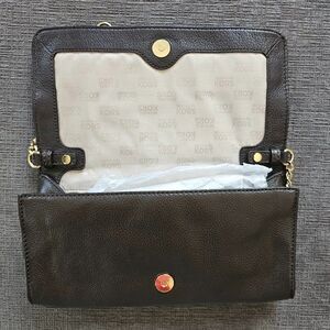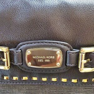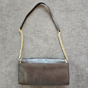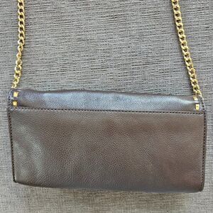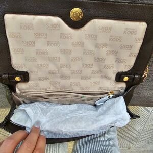 Michael Kors Brown Hamilton Whipped Leather & gold hardware Handbag Shoulder Bag, 6" X 10". The leather is very soft. Large outside flap, inside has 6 card slots, a zipper pocket and an open pocket. The chain & leather strap comes off to use the bag as a clutch.