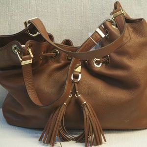 Michael Kors Brown Handbag; 21" W x 11" H x 4" D. Inner zipper pocket and 2 slip pockets along the inside wall; two slip pockets along the other inside wall; key chain attached to the inside of the purse. Pre-owned with minor wear.