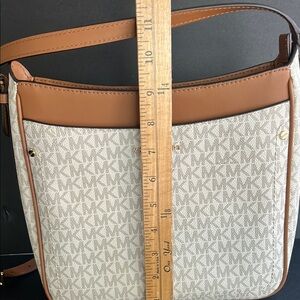 The Michael Kors shoulder bag showcases a sophisticated blend of brown and cream tones, accentuated by elegant gold hardware. Crafted with a structured design, it features the iconic MK logo pattern, offering a timeless and chic appeal. This bag is perfect for those seeking a blend of style and practicality, making it an ideal choice for any occasion.