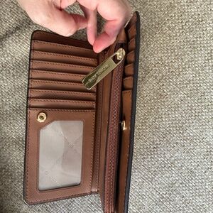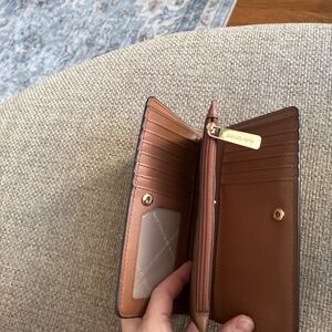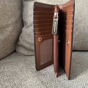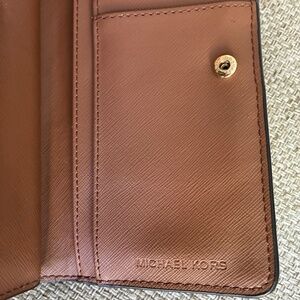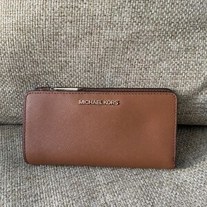 Authentic Michael Kors saffiano-leather wallet in rich brown with gold hardware. Features zip coin pocket, multiple card slots, and snap closure.