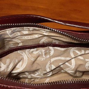 Michael Kors Burgundy real leather shoulder strap purse. This bag is a smooth, very soft leather. It's actually between a mid-size and large bag. The bag has a generous gathered 10.5 x 5.75 pocket across the whole front with the MK silver logo fob hanging from the drawstring cords for the gathered pocket. The silver logo fob is a beautiful 1.25 two-time silver circle and is not flimsy. It's a 1/2 inch think and very elegant looking.