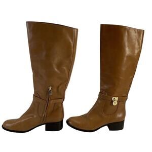 Michael Kors Hamilton riding boots in luggage-brown leather, size 9M. Classic equestrian silhouette with gold MK hardware and side zip. Minimal wear—soles are nearly flawless. Originally $295, these embody the Y2K revival and Taylor Swift’s folklore-era aesthetic now defining Runway 2025’s heritage look. Perfect with floaty dresses, denim, or tailored coats.