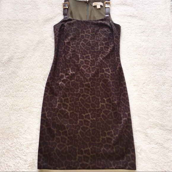Chic Michael Kors Brown leopard print dress. Made of polyester and spandex to fit your curves perfectly! Includes leather strap detail. Some snagging in the chest area as shown. Size XS. Good used condition.