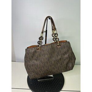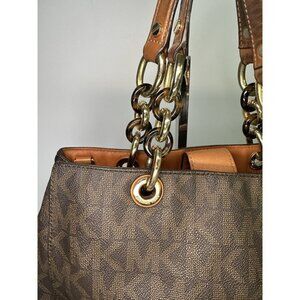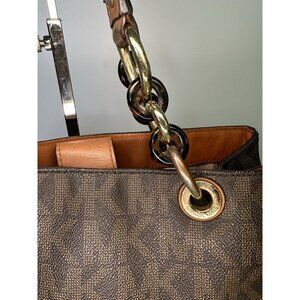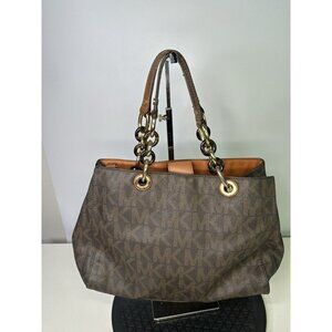 The Michael Kors Brown Logo Shoulder Tote Bag is a stylish and spacious large shoulder bag designed for women. Made from a combination of coated canvas and leather, this bag features the iconic Michael Kors logo pattern on the exterior. With a width of 15 inches at its widest point, height of 11 inches at the center, and depth of 4 inches, this tote bag offers plenty of room for all your essentials. The brown exterior color adds a touch of elegance to this modern and practical accessory. Ideal for everyday use or special occasions, this shoulder bag from Michael Kors is a versatile and chic addition to any wardrobe.