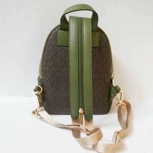 Stylish mini backpack by Michael Kors. Features a brown monogram design. Gold-tone hardware adds elegance. Perfect for daily use.