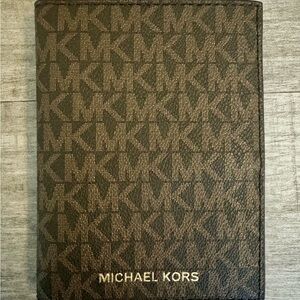 Stylish Michael Kors Jet Set passport holder with monogram design. Features a brown color.