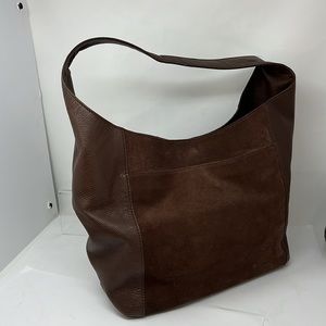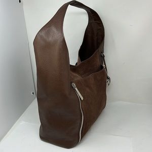 Elegant brown shoulder bag. Features silver-tone hardware. Spacious and stylish design.