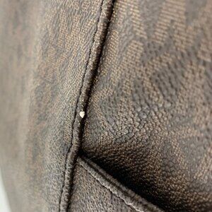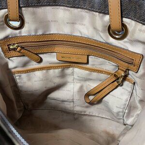 This Michael Kors Jet Set Tote offers a stylish blend of functionality and luxury. Crafted from brown signature coated canvas, it features ample space for essentials and an elegant bag charm. Perfect for any occasion, it's the ideal accessory for adding sophistication to your ensemble.